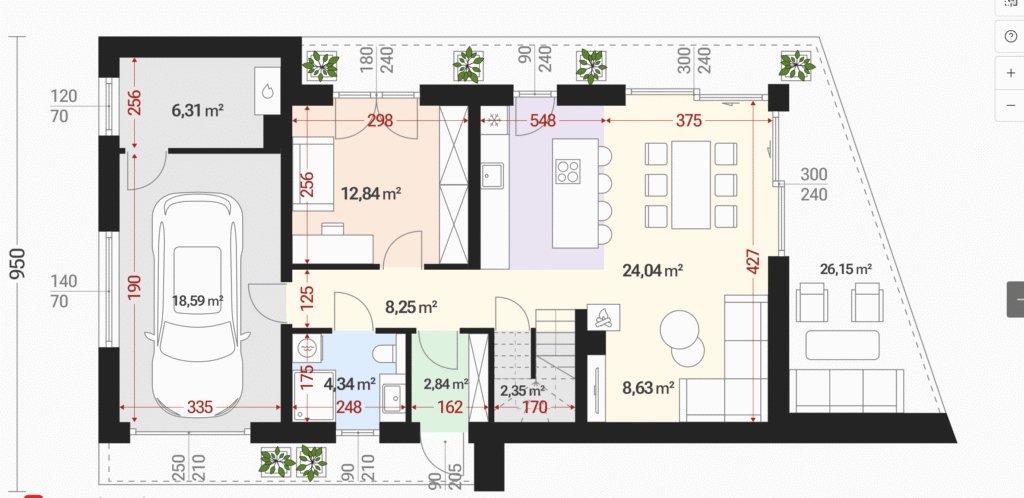 Znajduje się tu salon z jadalnią i otwartą kuchnią, tworząc idealne miejsce do rodzinnych spotkań. Liczne przeszklenia otwierają wnętrze na ogród i zapewniają dostęp naturalnego światła.